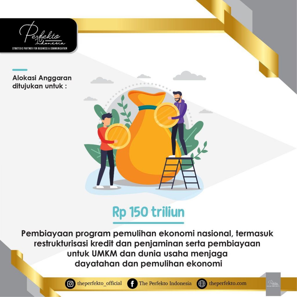 Melalui Perppu ini, Pemerintah mengalokasikan tambahan APBN 2020 sebesar Rp 405,1 triliun yang ditujukan untuk 4 persoalan. Diantaranya pemulihan ekonomi nasional, pendukung kesehatan, jaring pengaman sosial, serta insentif perpajakan dan stimulus KUR.