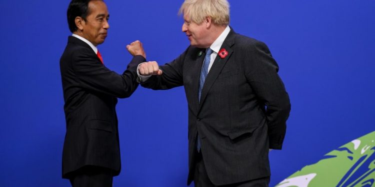 Presiden Joko Widodo melakukan pertemuan bilateral dengan Perdana Menteri Inggris Boris Johnson, di sela-sela pelaksanaan Konferensi Tingkat Tinggi (KTT) Pemimpin Dunia COP26, di Scottish Event Campus, Glasgow, Skotlandia, pada Senin, 1 November 2021.