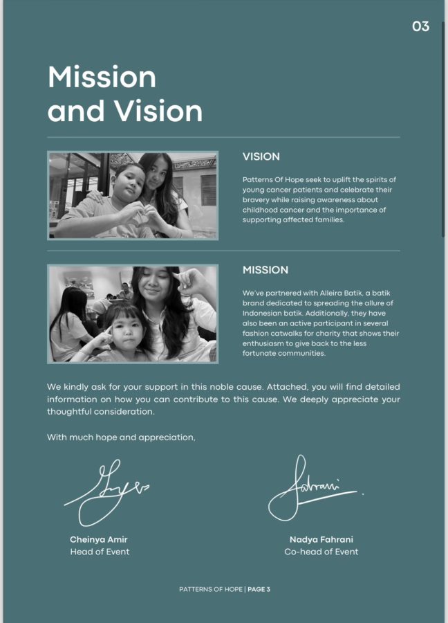 Ketua event Patterns of Hope, Cheinya Amir bersama Wakil Ketua Nadya Fahram, yang masih duduk di kelas 1 SMA ini mengungkapkan kegiatan Patterns of Hope digelar sebagai ajang untuk membantu dan memberikan kepedulian kepada anak-anak pengidap kanker di Indonesia.